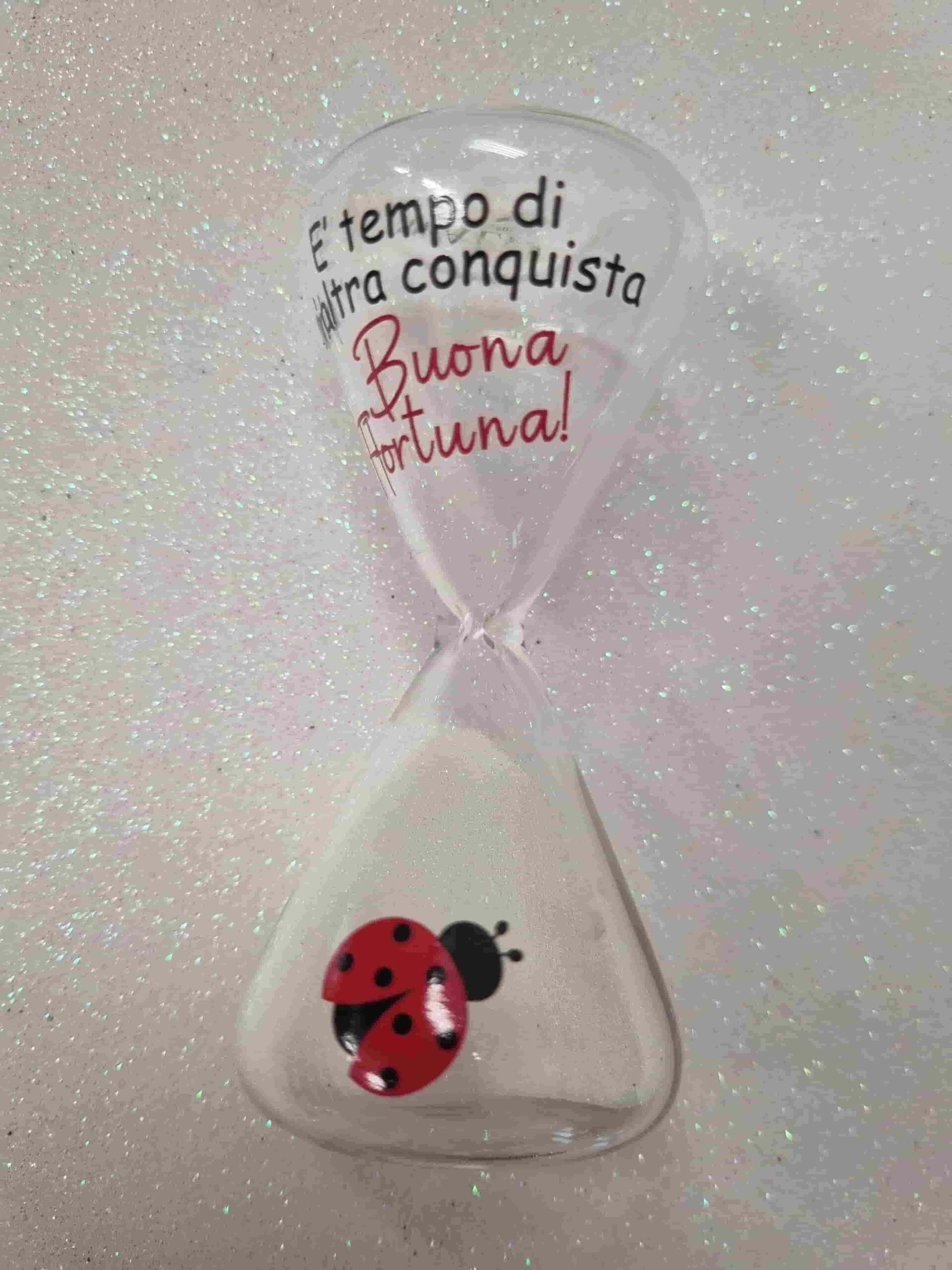 Clessidra in vetro borosilicato, con frase E’ il tempo di un’altra conquista. Buona fortuna.