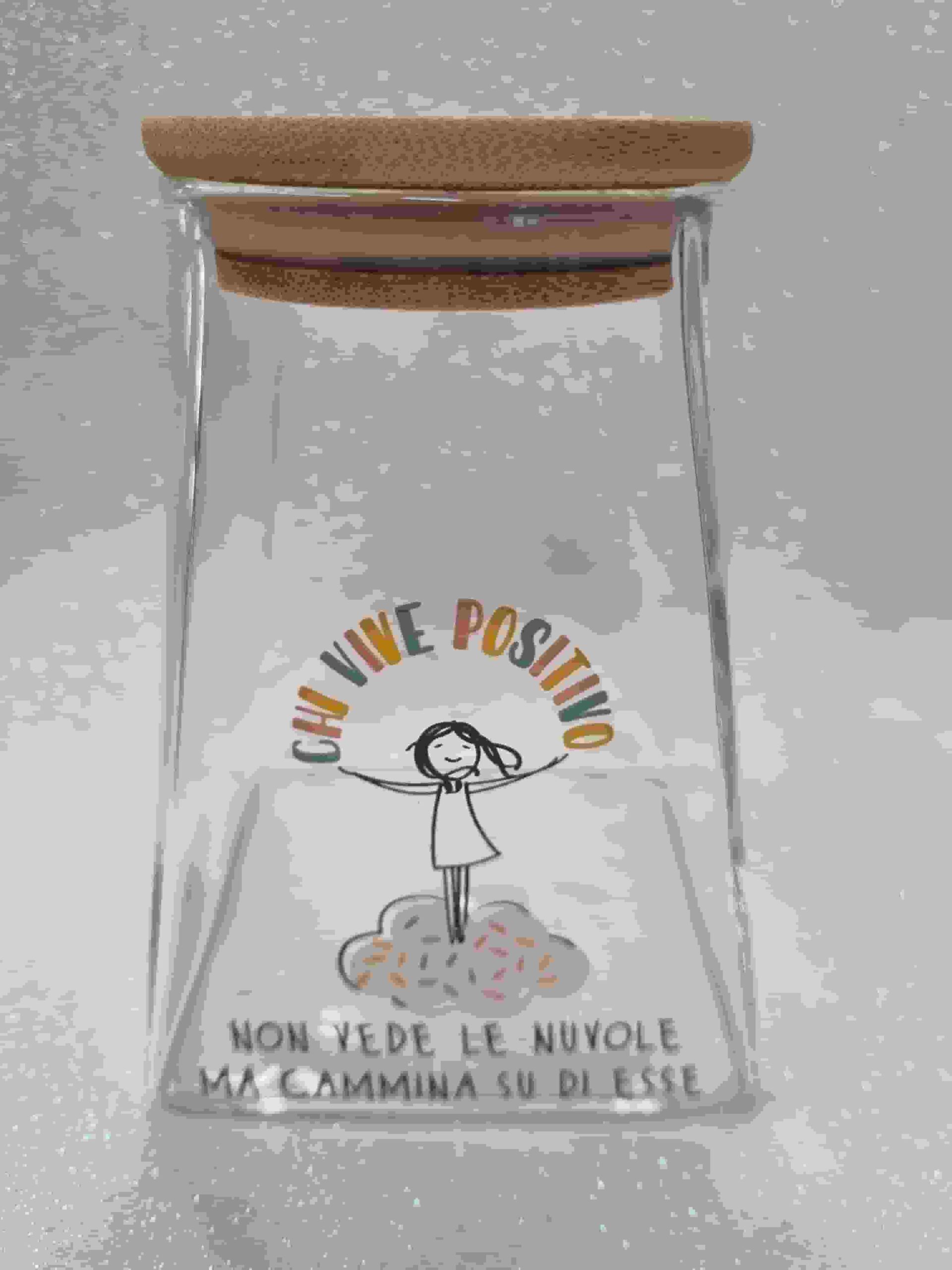 Barattolo in vetro borosilicato von tappo in legno e guarnizione, con scritta Chi vede positivo non vede le nuvole ma cammina su di esse. cm 8,7 x 8,7 x 12,3h.