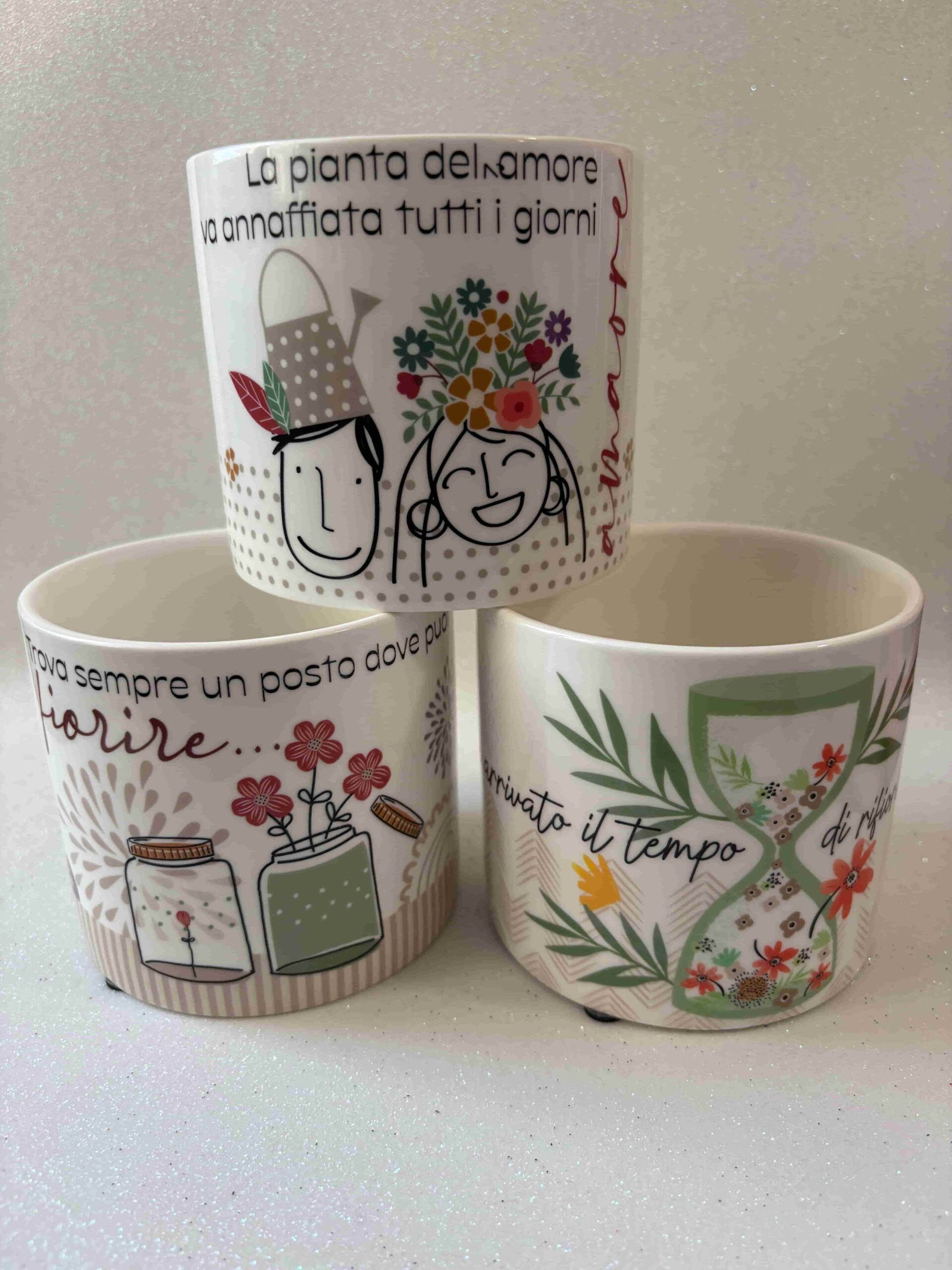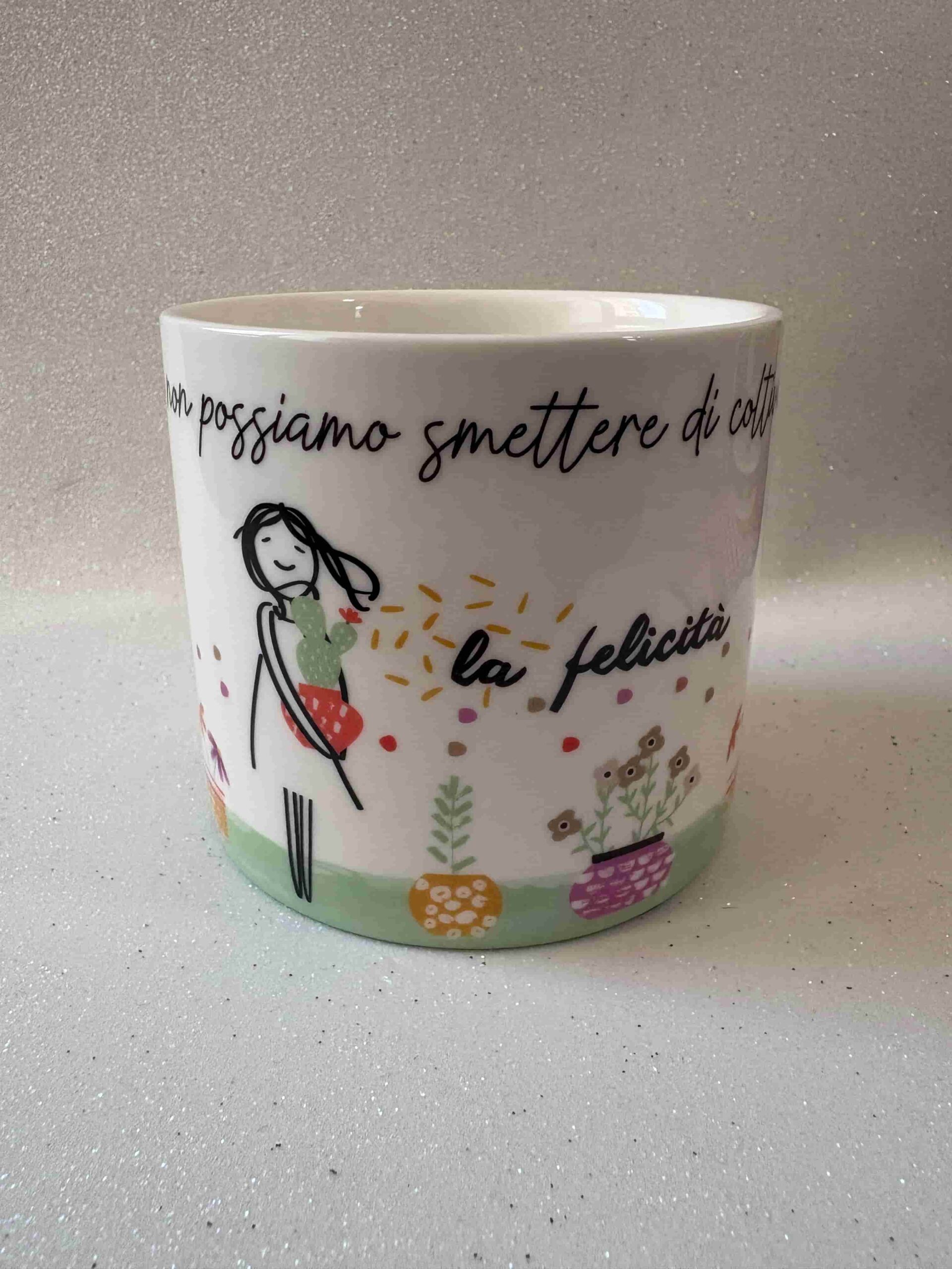 Vaso in porcellana con frase: “Non possiamo smettere di coltivare la Felicità”.