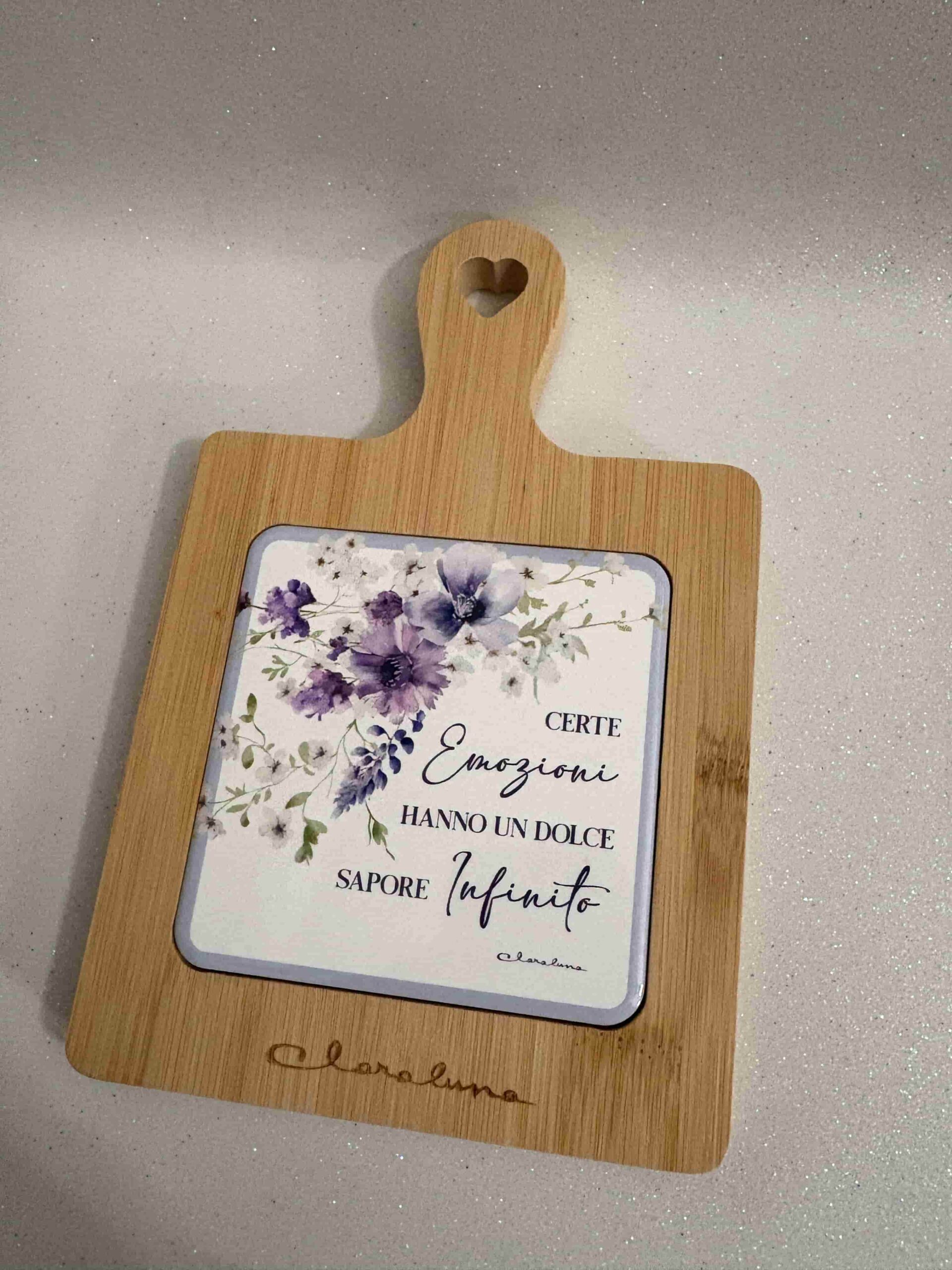Tagliere bamboo con frase: “Certe emozioni hanno un dolce sapore infinito” anche con confetti e confezione con coltellino per formaggi a parte